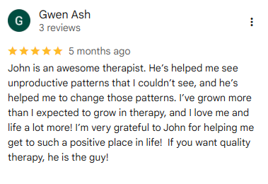 Review from Gwen Ash praising John, an therapist, for helping change unproductive patterns and improve her life.